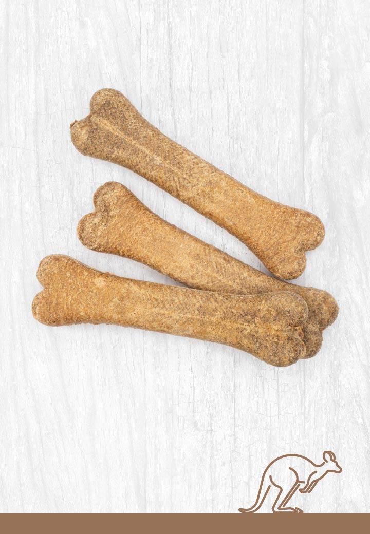 Sehr feste Gebäckknochen mit getrocknetem Kängurufleisch und glutenfreien Zutaten. In zwei Größen erhältlich. Ideal zur Unterstützung der Zahnpflege und auch bei eiweißreduzierter Fütterung geeignet.
