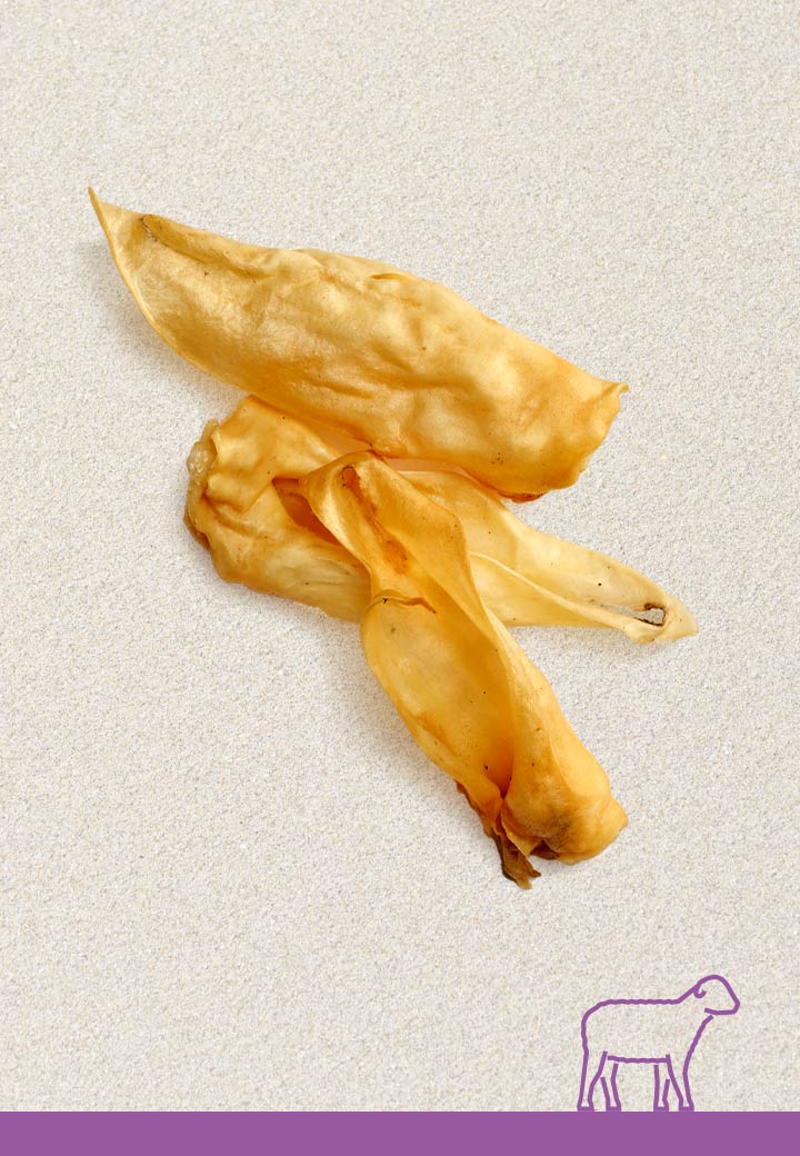 Getrocknete Lammohren. Ideal für kleine und mittelgroße Hunde. Je nach Kauverhalten zur Unterstützung der Zahnpflege geeignet. Nicht portionierbar.