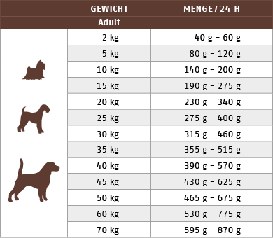 Bei den in Gramm angegebenen Mengen handelt es sich um Durchschnittswerte, abhängig von Alter, Rasse und Aktivität des Tieres. Wasser zur freien Aufnahme anbieten.