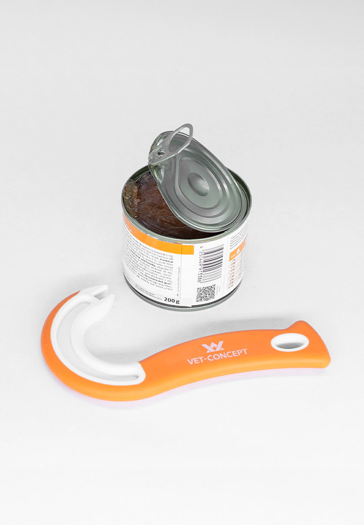 Mit diesem praktischen Helfer für Zuhause wird das Öffnen der Vet-Concept Nassnahrung zum Kinderspiel. Die Lasche der Dose kann mit der Öffner-Hilfe angehoben werden. Anschließend nutzt man den handlichen Griff des Hakens zum Aufhebeln des Deckels. Dabei drückt die Rundung des Öffners auf die Deckelmitte und erleichtert das Hochziehen.